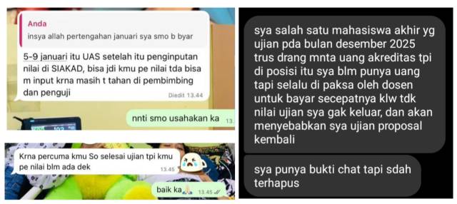 ”Saya selalu didesak oleh dosen untuk bayar secepatnya. Kalau tidak, nilai ujian saya tidak keluar dan saya harus ujian proposal kembali,” lanjut NL, (01/03/26).