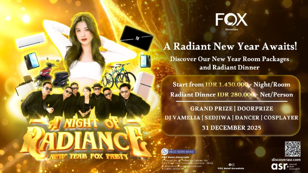 Zen Seru! FOX Hotel Gorontalo resmi meluncurkan tema perayaan Tahun Baru mereka: “A Night of Radiance – New Year FOX Party”. Sebuah pesta akhir tahun yang dirancang untuk jadi malam paling seru, paling meriah, dan paling penuh hadiah di kota ini.